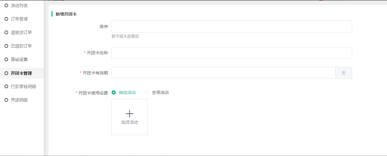 2, 新建开团卡:设置开团卡排序(数字越大排在前面,仅后端开团卡列表的显示),开团卡名称,开团卡有效期(设置为0发放后大概十分钟过期),开团卡活动,指定活动可设置多个