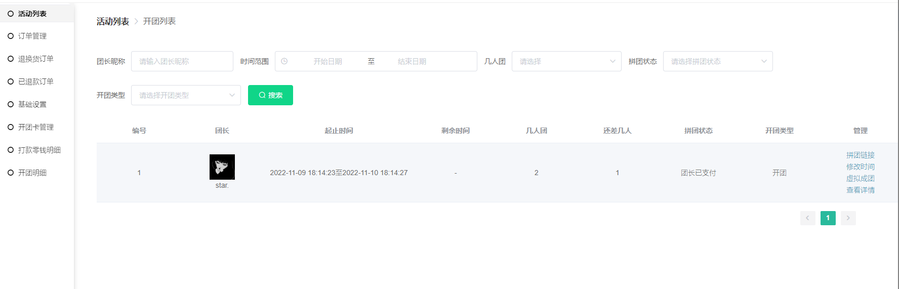 1) 此列表显示拼团团长、起止时间、剩余时间、几人团、还差几人、拼团状态、开团类型