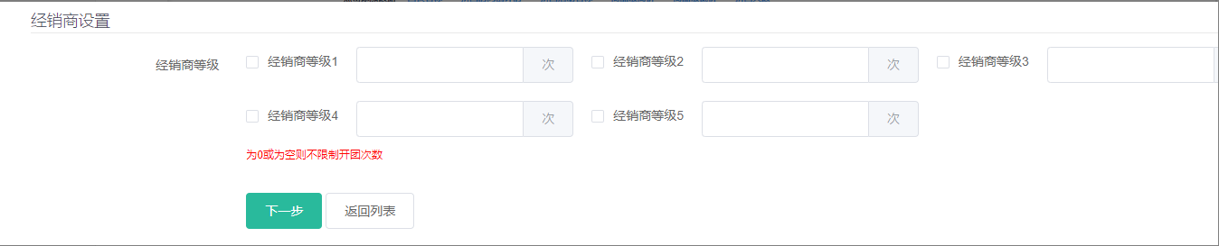14) 经销商设置:全部不勾选则按照基础设置;只勾选一个其他不勾选,则没勾选的经销商不能开团;勾选了的可设置总开团次数,设置为0则不限制次数