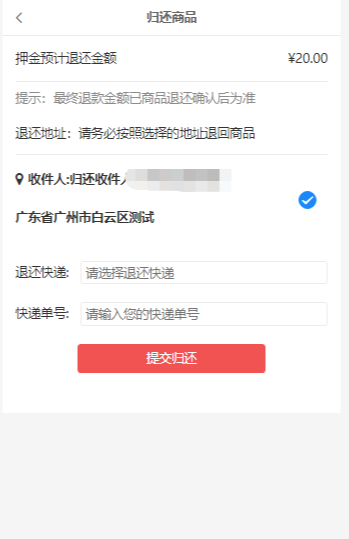 支持添加多个归还地址:联系人、手机、邮编、归还地址、是否默认地址,用户归还租赁商品时可以选择归还到添加的任意地址。
